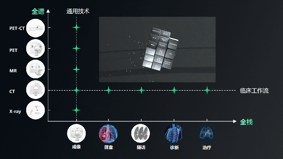 多年来,联影智能深耕医学影像领域,凭借全栈全谱的创新策略,已研发出覆盖多模态、多病种的40余款AI应用,推出针对不同医疗场景,如胸痛、卒中、肿瘤、体检等多个融合解决方案,几十个基于卷积神经网络的辅助阅片产品均可为大模型的开发和优化提供技术支持。