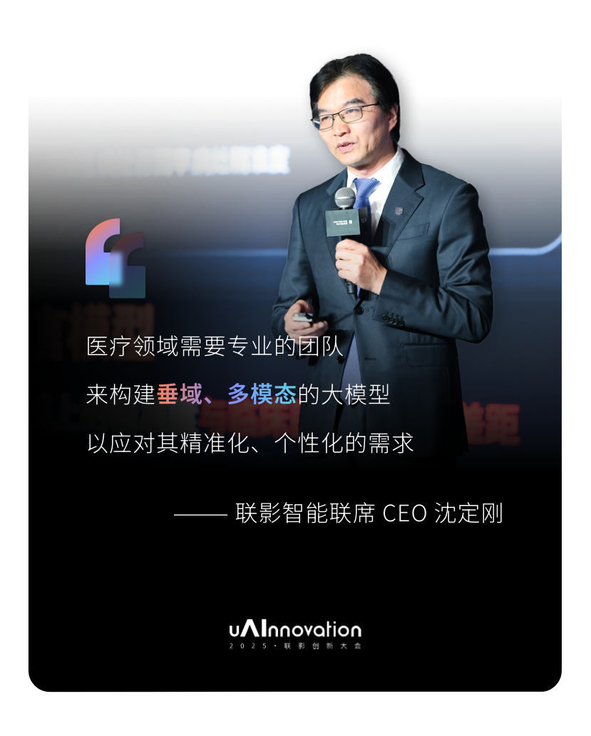联影智能联席CEO沈定刚在uAInnovation 2025联影创新大会中明确表示,医疗领域具有精准化、个性化的特殊需求,这就需要专业的团队来构建垂域的多模态医疗大模型,才能更好地服务于医疗行业。