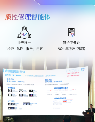 联影智能质控管理智能体是目前业界唯一实现「检查-诊断-报告」闭环的AI一站式质控应用,包含影像质控和报告质控,能够从源头提升影像质量、自动识别报告文书中的常见错误、智能提示并上报15种危急病种,符合国家卫健委发布的2024年版质控指南。