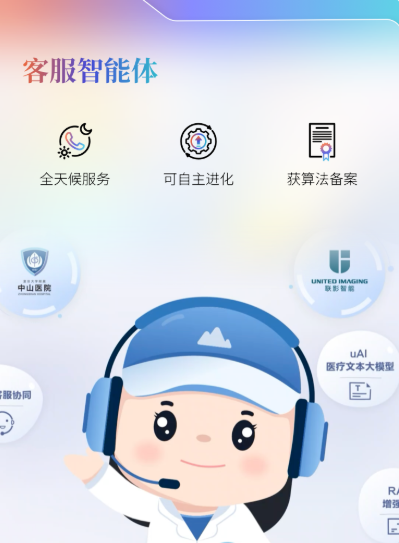 其中,客服智能体是中山医院与联影智能共同研发的「有爱小山-智能客服」,依托「元智」文本与语音大模型,具备医学语义理解及自然语言交互能力,可7×24小时回应患者关于疾病、检查流程等常见问题。「有爱小山-智能客服」已于2025年年初正式上线中山医院官方电话、微信官方小程序双渠道,并于2025年3月12日正式获批中央网络安全和信息化委员会办公室算法备案。