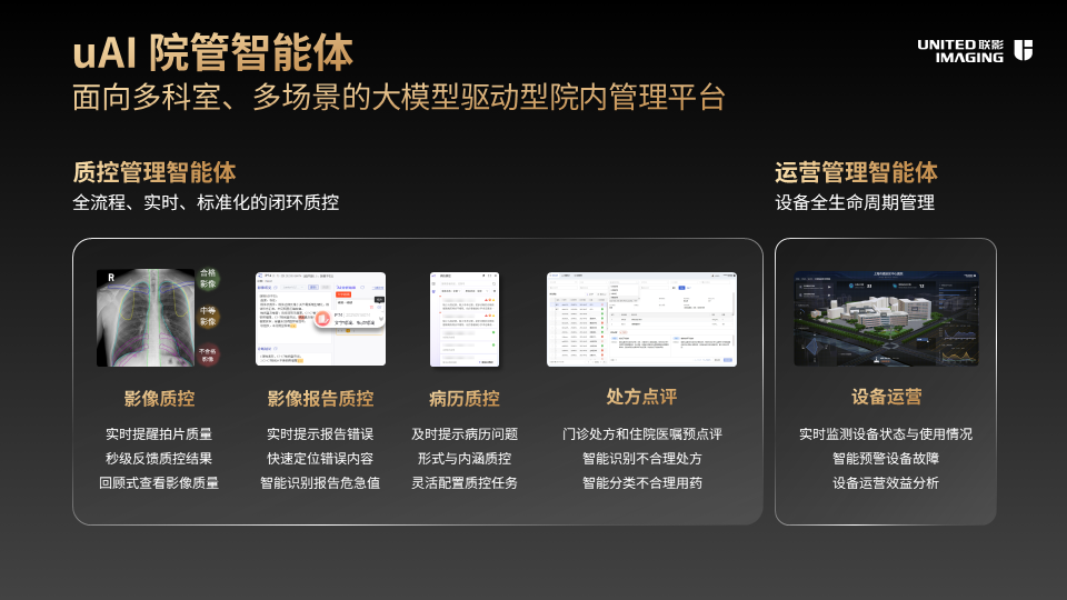 自2023年发布uAI影智医疗大模型后,联影智能并未停下创新脚步,而是持续深耕医疗大模型领域,历经两年技术升级与实践打磨,终于在2025年推出联影「元智」医疗大模型。这款多模态医疗大模型由文本、影像、语音、视觉、混合五大模型组成,如同搭建起医疗全场景的“认知中枢”。在此基础上,10余款医疗智能体孕育而生,精准赋能医护端、患者端和管理端三大细分需求场景,其中,两款医院管理智能体更是能在极大程度上助力管理者优化医院运营。