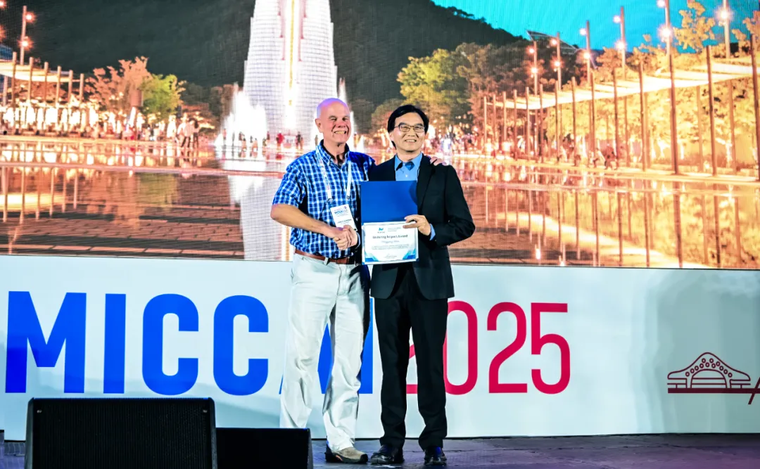 (MICCAI 2025现场,沈定刚教授上台领奖)